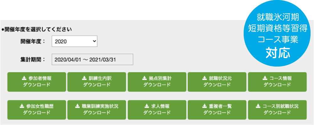 職業訓練の実施から、就職斡旋までの管理・運営業務、事業報告までをオンラインで一括管理!